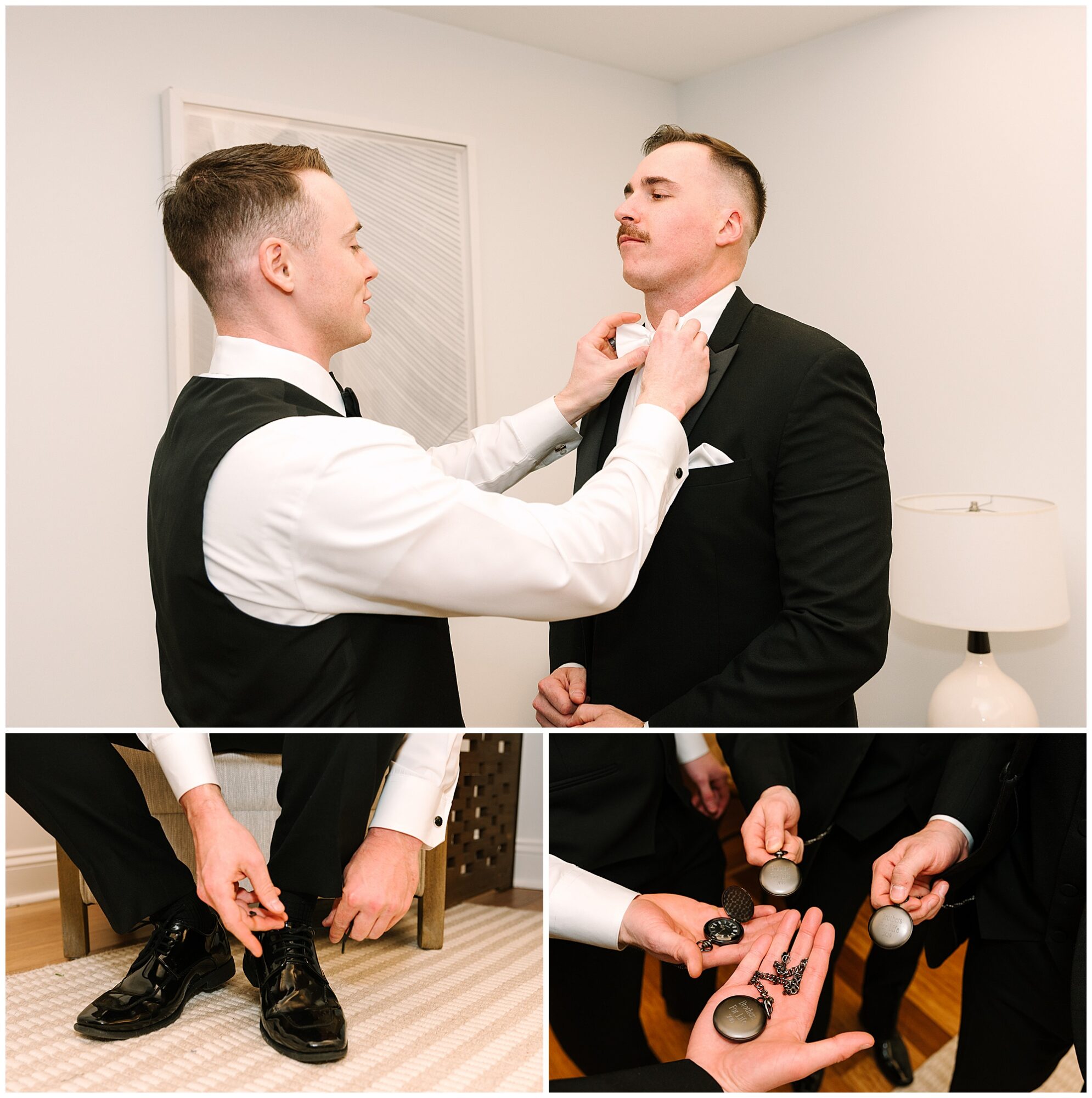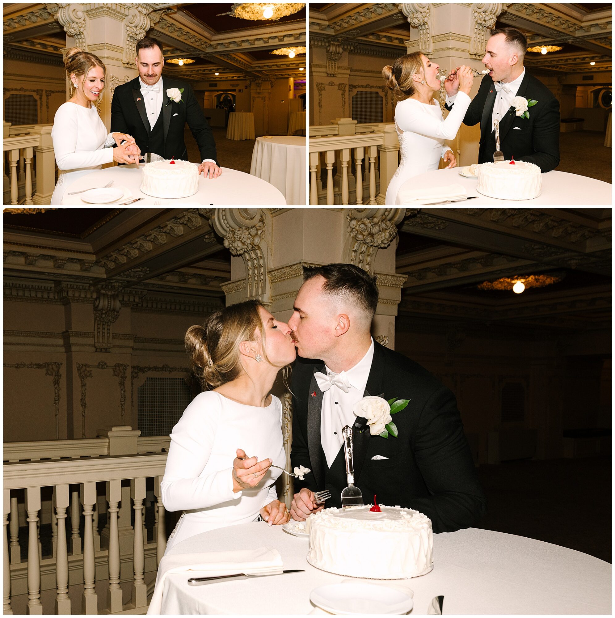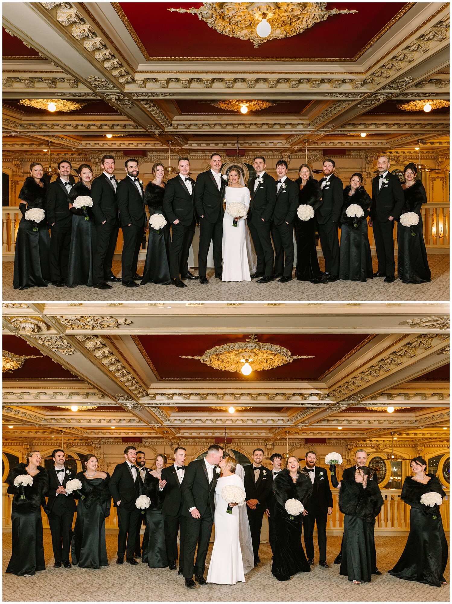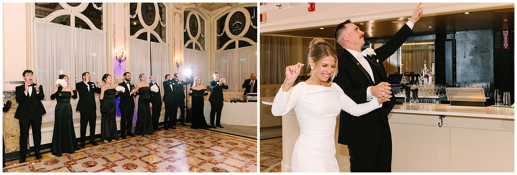 The wedding party set the tone with dressed in timeless black gowns and tuxes, adding to the sophisticated vintage aesthetic. Kelsey’s gown, from Ivory Bridal, was effortlessly beautiful with a vintage inspired feel that perfectly complemented the venue. Later in the evening, she changed into a short party dress. The two were ready to fully embrace the New Year’s Eve energy!