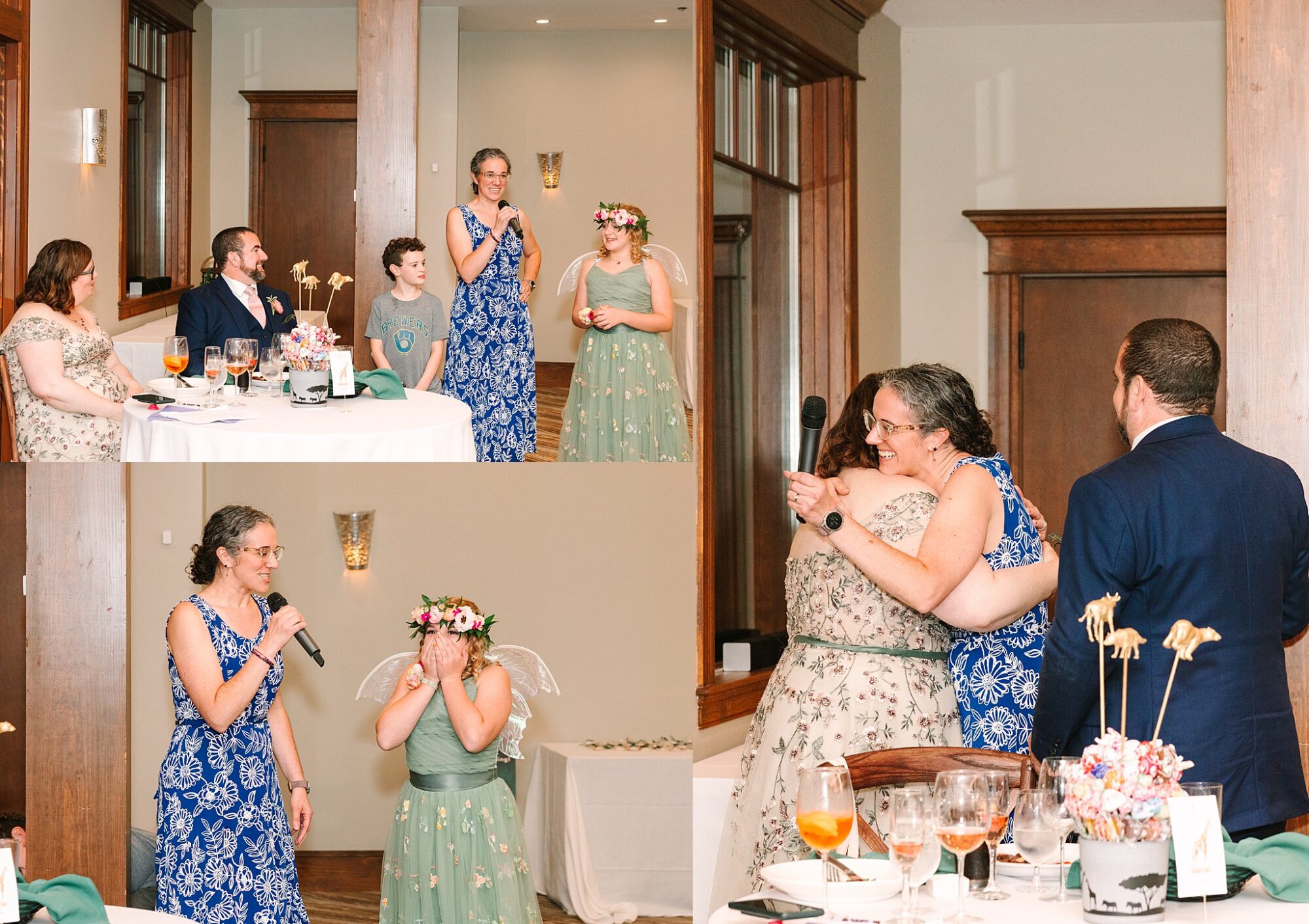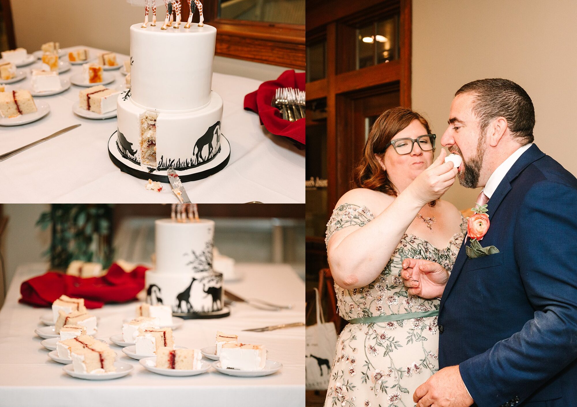 The skies decided to open up right after the first kiss! Everyone made a mad dash for the beautiful carousel for cocktail hour. The indoor space allowed for a dry space and AMAZING photos! The carousel animals fit right in with the wedding’s zoo theme.